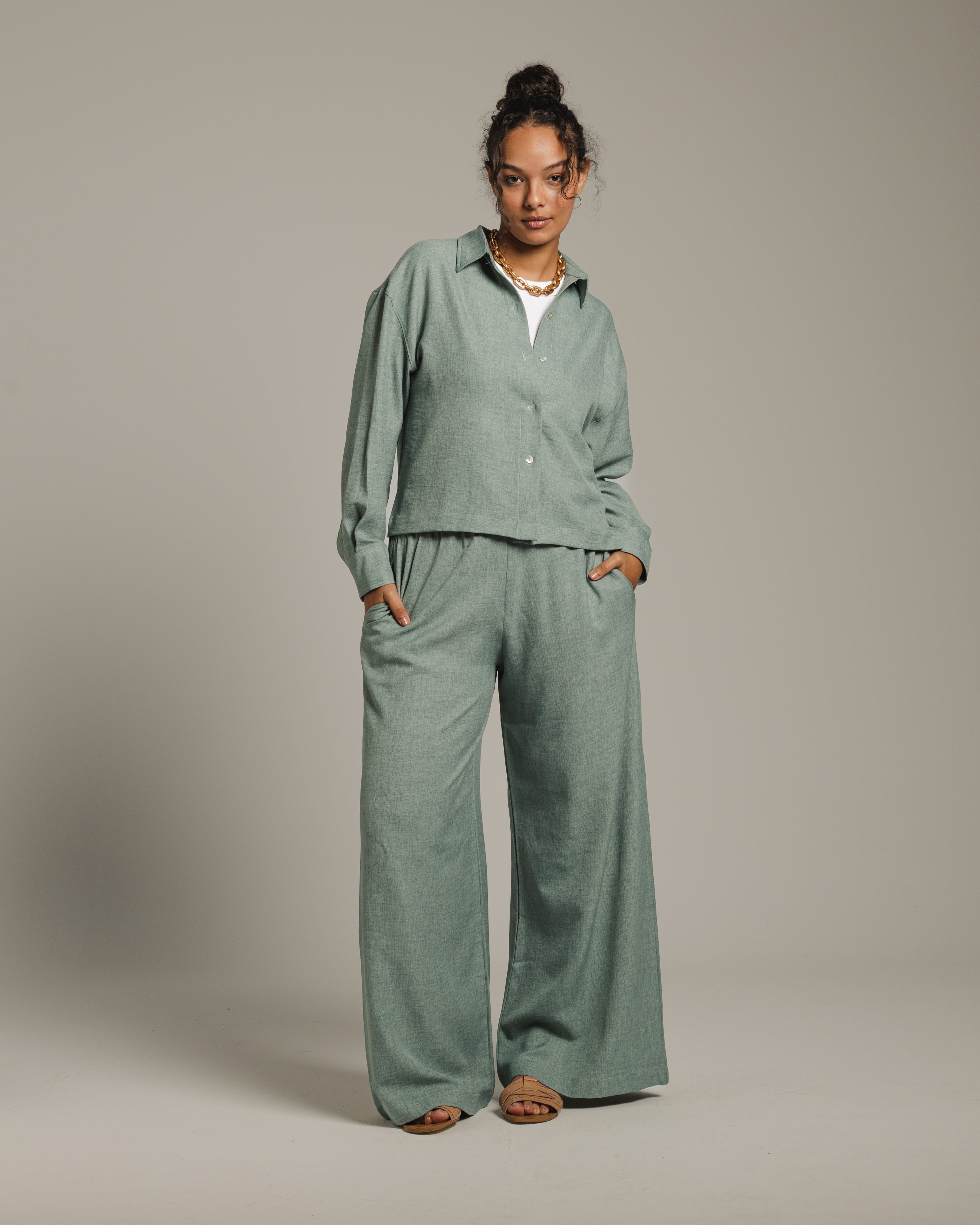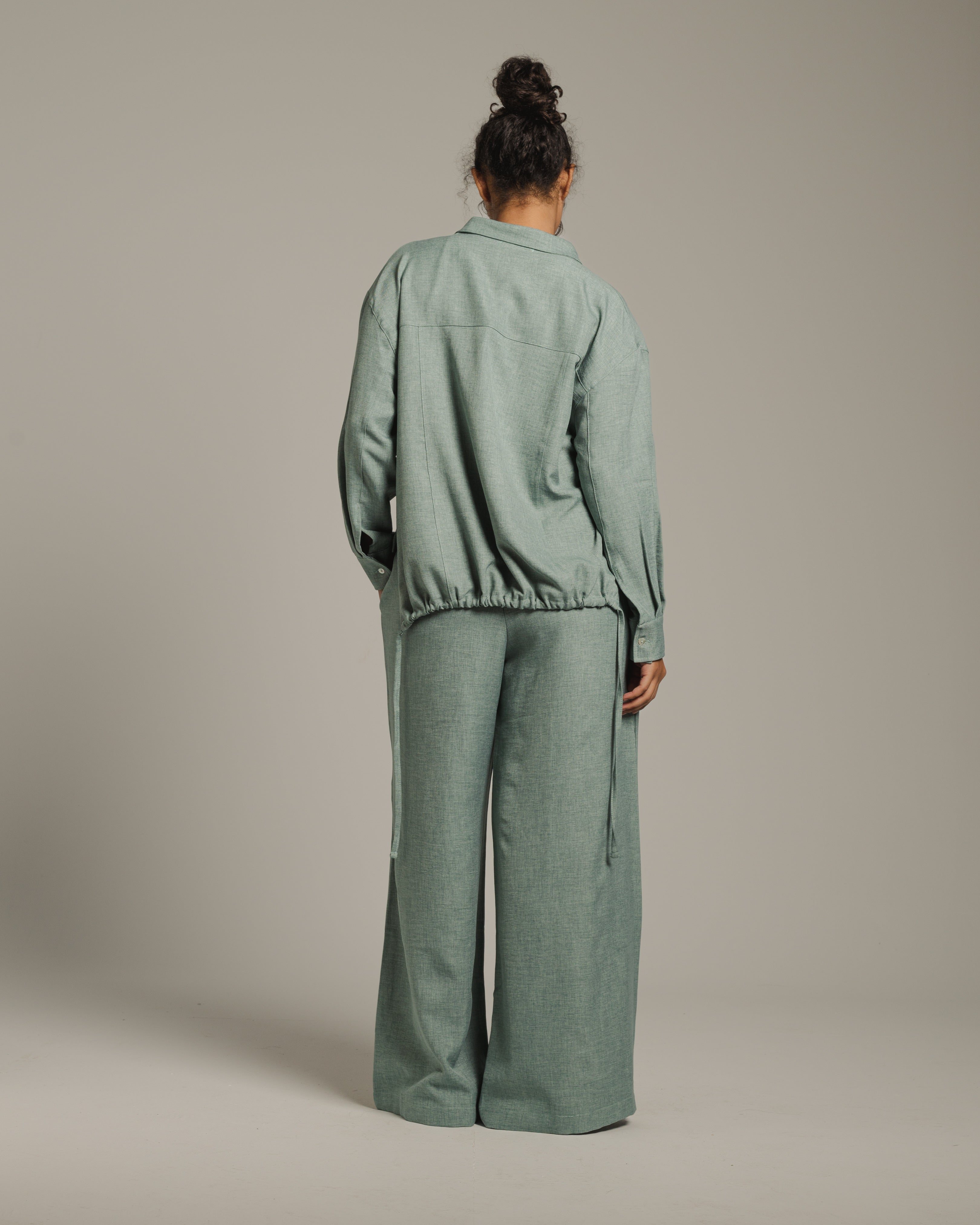 • This set features a breezy blouse and pants